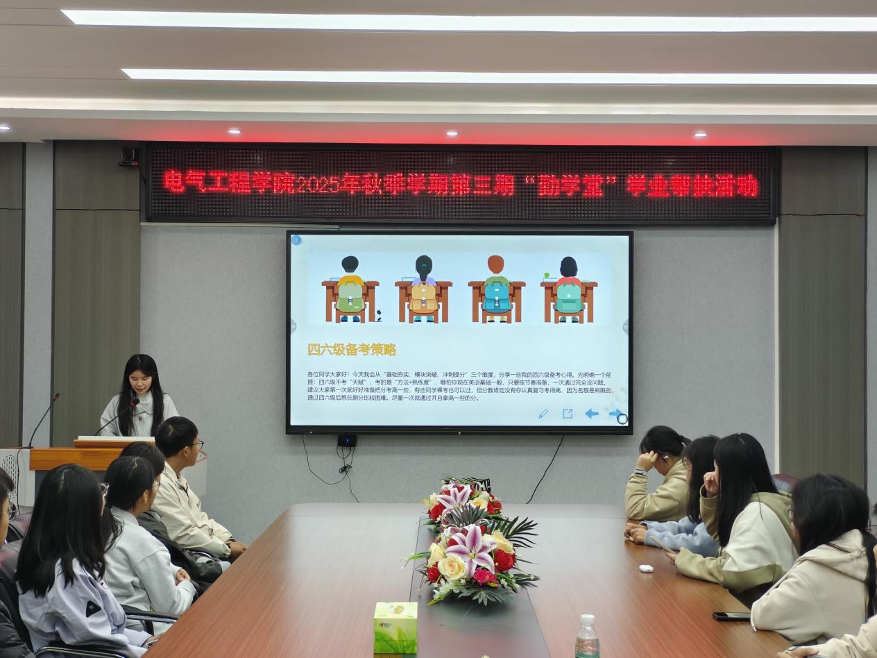 11月4日,ok138cn太阳集团古天乐于电气楼B301会议室成功举办2025年秋季学期第三期“勤学堂”学业帮扶活动。本期活动的主题为“英语四六级备考经验分享”,特邀国家奖学金获得者唐鑫担任主讲,为在场的同学们带来一场内容详实、针对性强的备考指导。